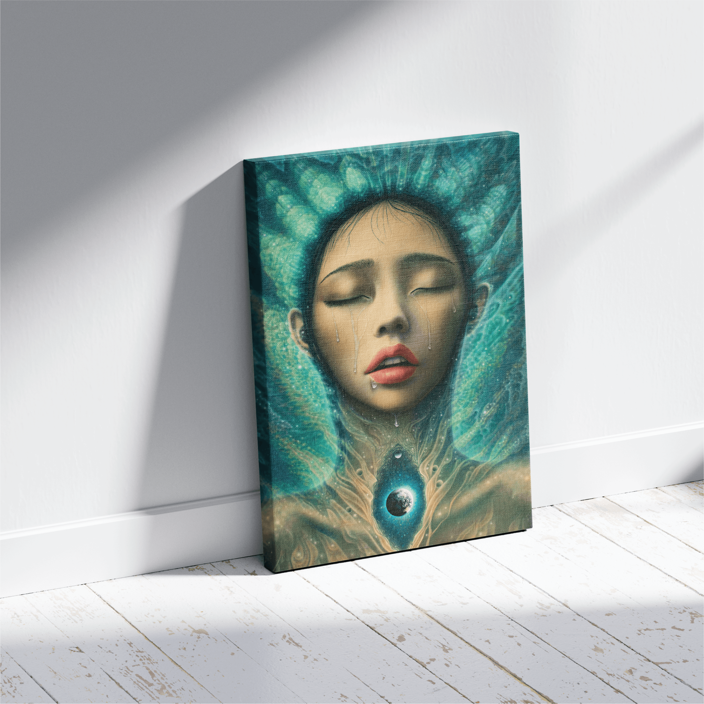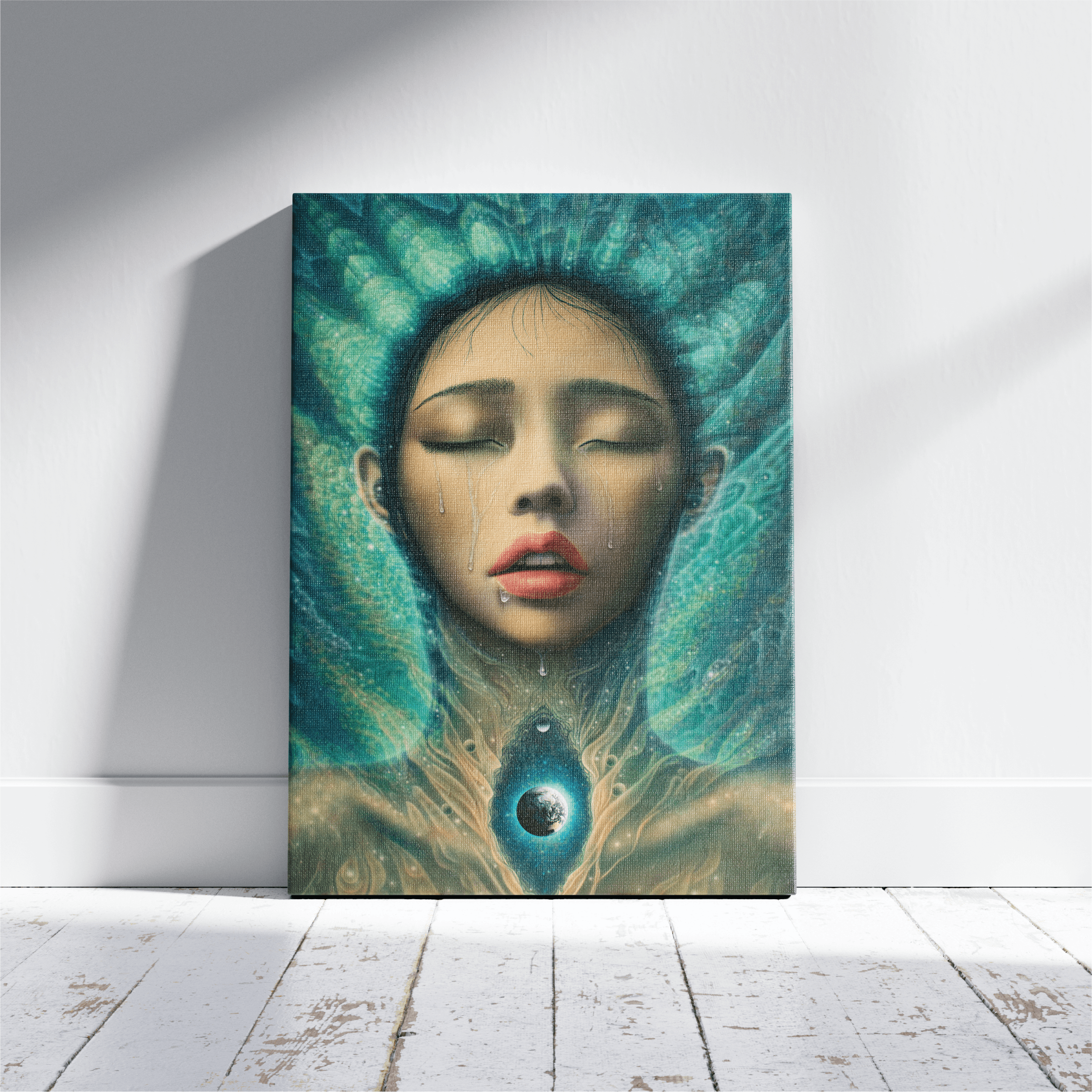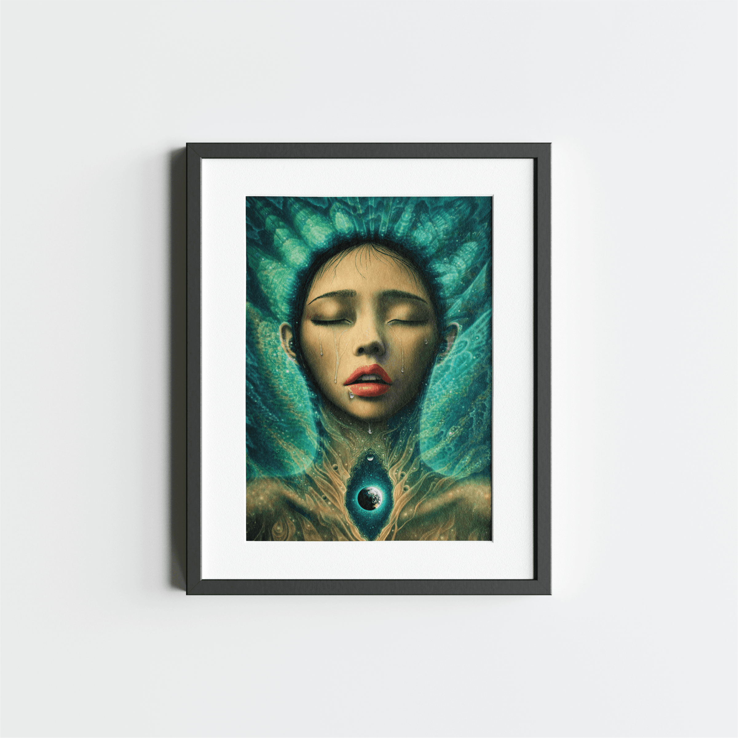 A serene feminine presence floats in a state of deep surrender. Her eyes gently closed as she dissolves into a vast oceanic field of energy. In her stillness she becomes exquisitely receptive, feeling the pulse, pain, and beauty of the entire Earth moving through her body. The planet itself glowing at her throat like a living song. Tears stream from her eyes and a soft droplet falls from her lips. Expressions of an overwhelming empathy that arises when she relaxes enough to hold the weight of the world. Earthsong captures this moment where rest becomes communion and the feminine opens so fully that she becomes a vessel for the emotional breath of the planet.