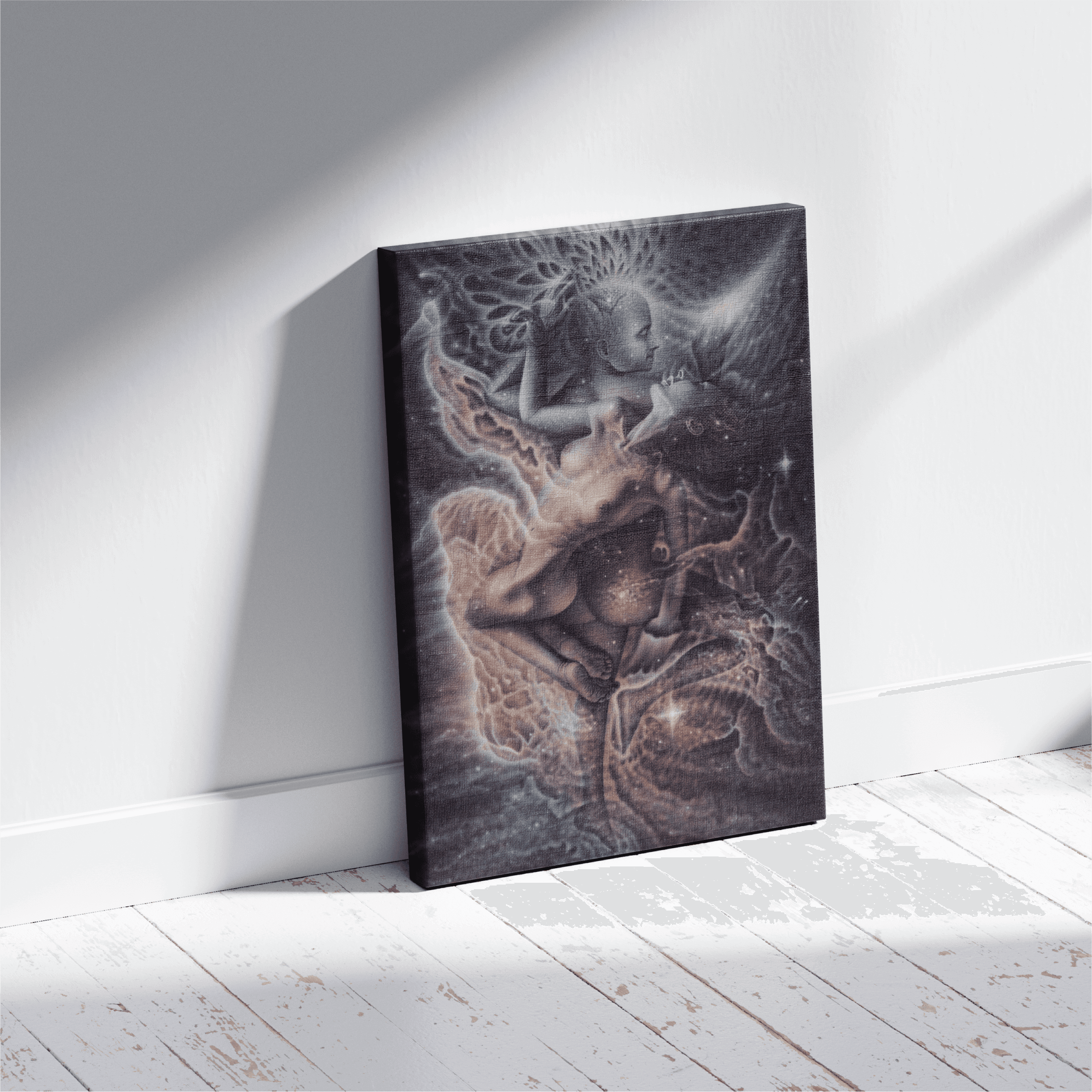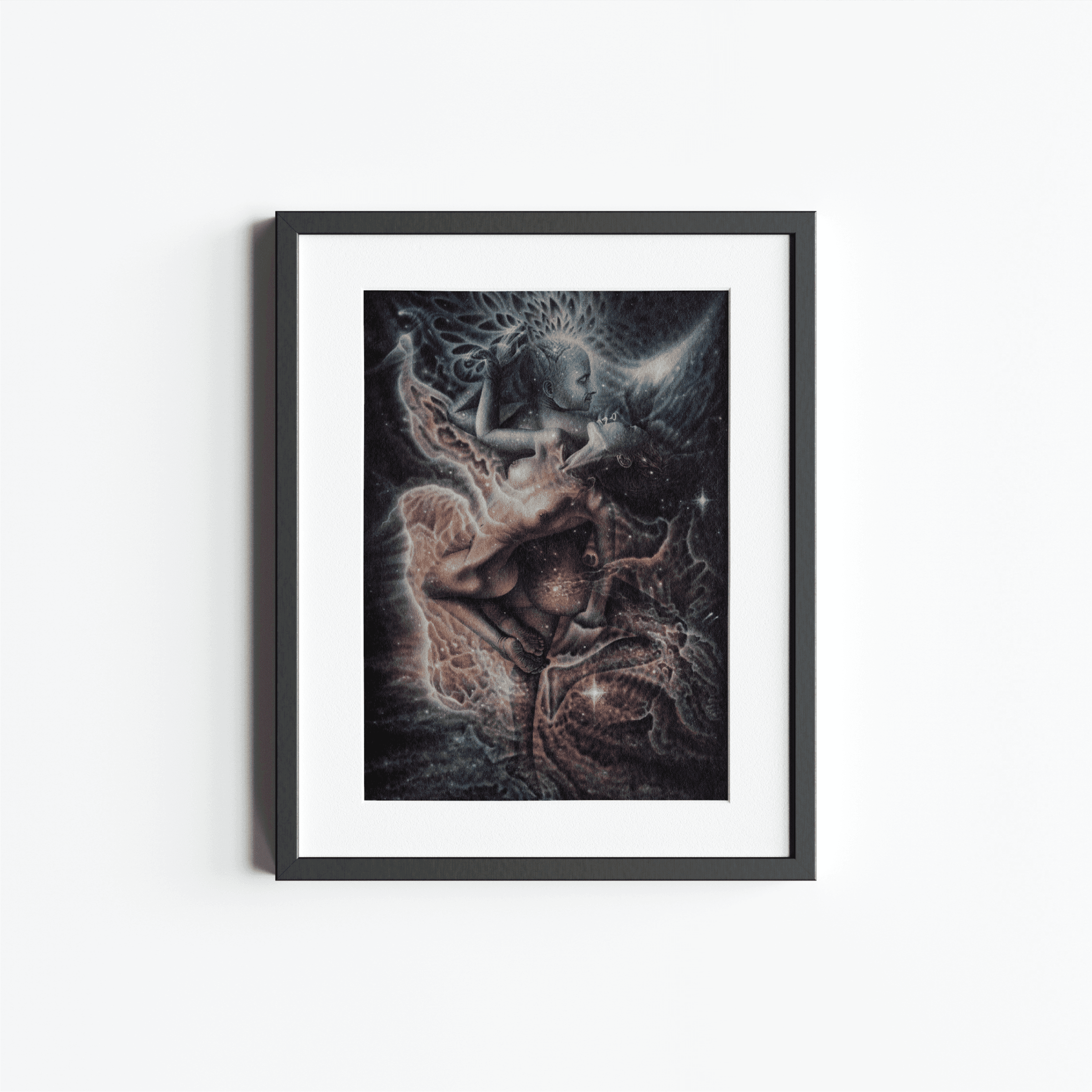 Two ethereal figures intertwine in a weightless cosmic space. Their bodies merging in a fluid exchange of energy and presence. The upper figure radiates intricate blossoming patterns from the mind, while the lower figure arches open in surrender, bathed in soft celestial light. Surrounding them, currents of stardust and organic wave-like forms pulse as if the universe itself is participating in their union. The painting evokes a sense of sacred intimacy where physical connection becomes a gateway to transcendence, transformation and the dissolving of self into something vast and eternal.