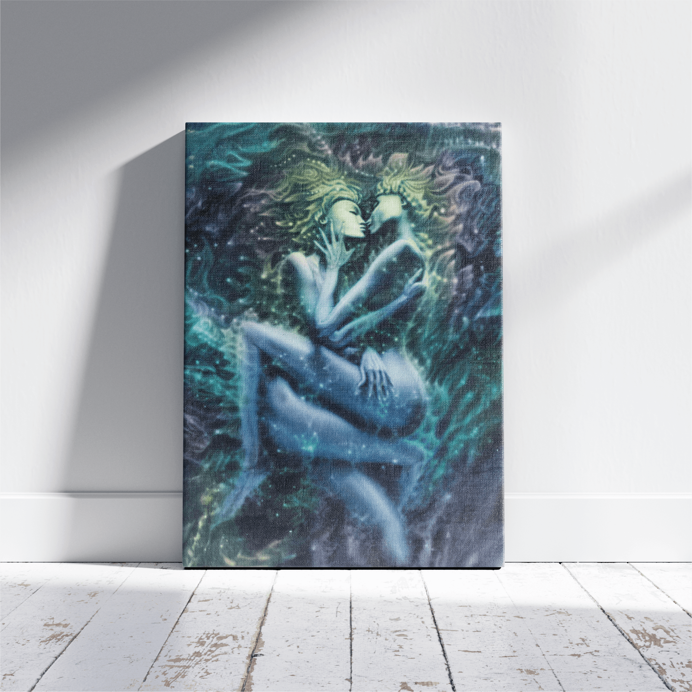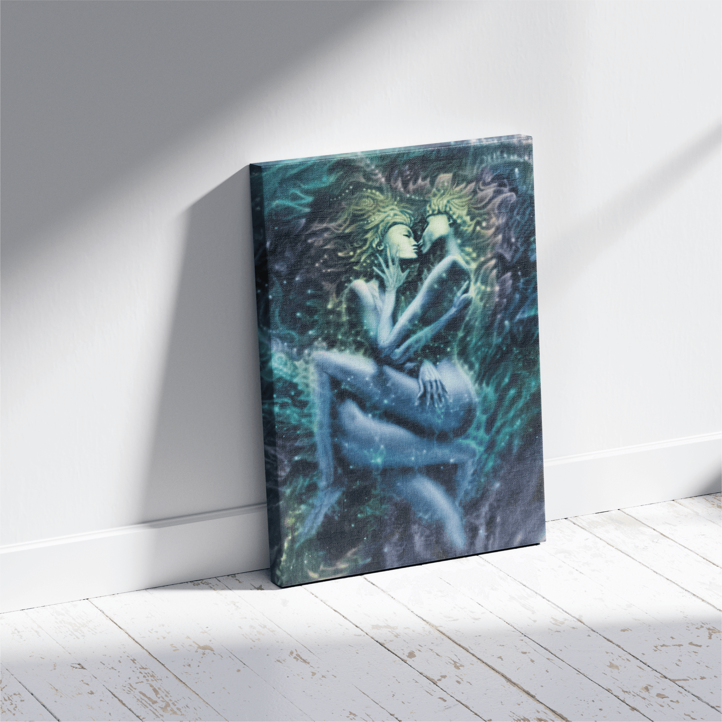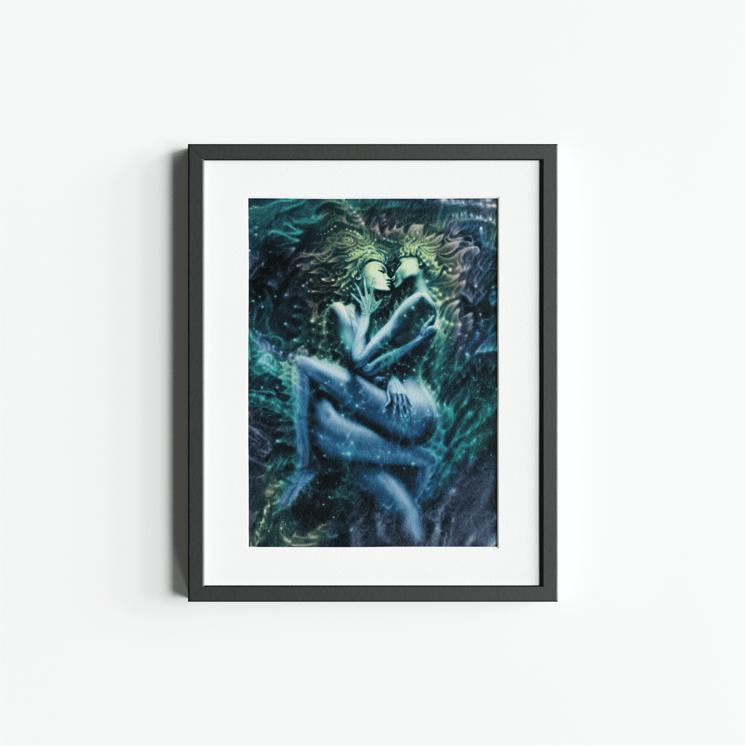 This circular painting portrays two feminine beings entwined in an intimate, weightless embrace. Their bodies dissolving into one another as if made of starlight and breath. The anticipation before the kiss becomes a point of ignition where sensual bliss radiates outward transforming love into a cosmic force. The figures seem suspended in a womb of the universe suggesting that feminine love is both deeply tender and profoundly generative. An ecstasy that awakens the hidden magical colors of existence itself.