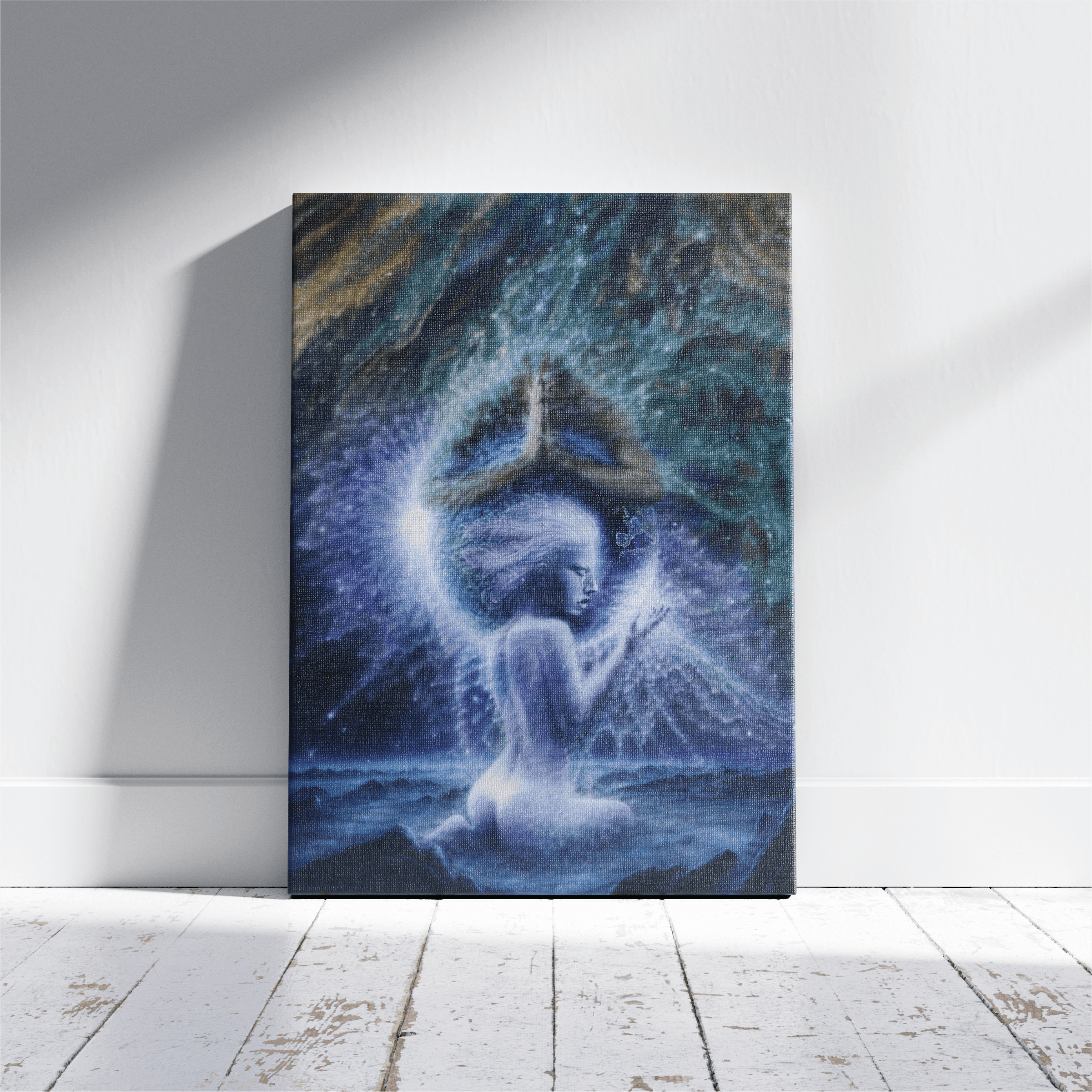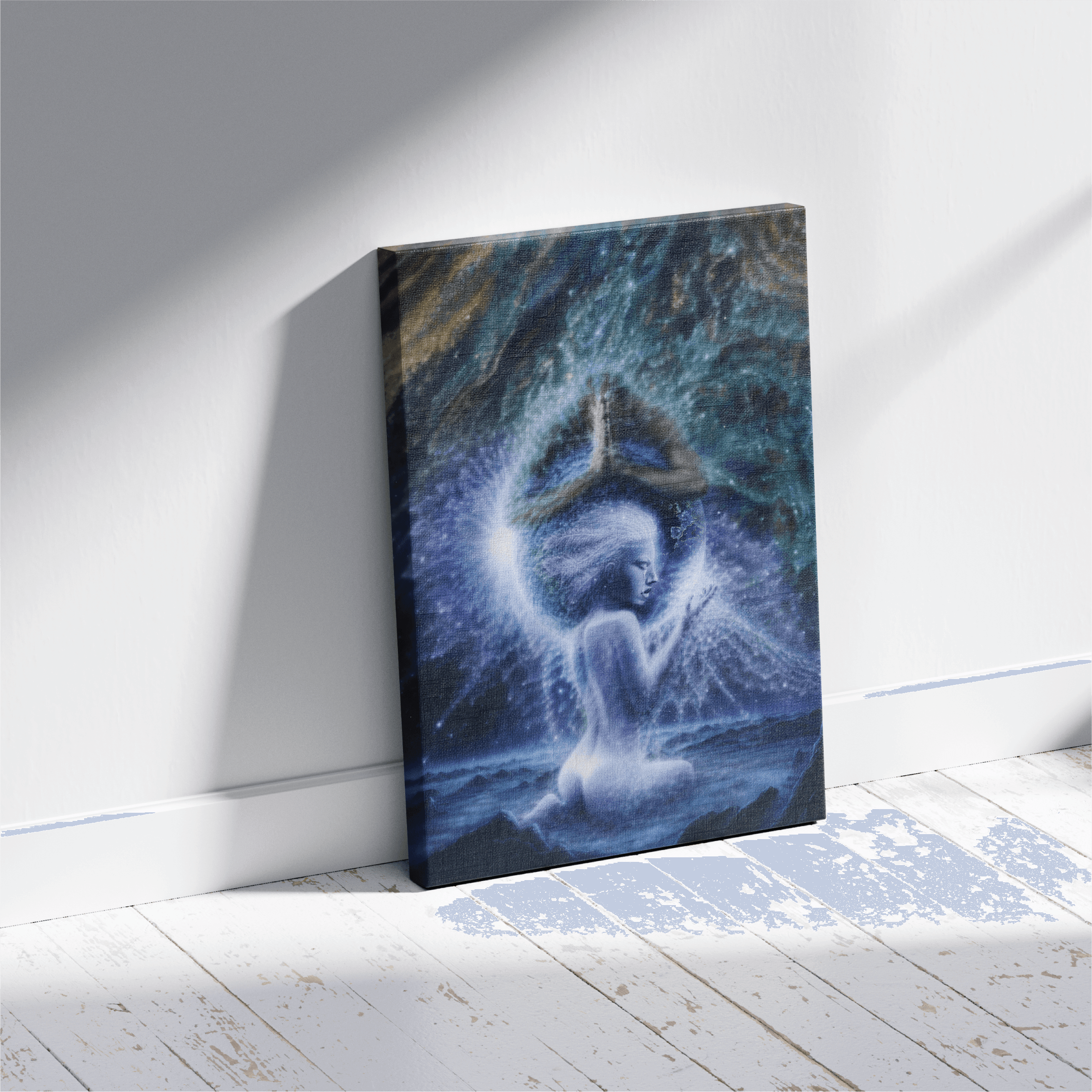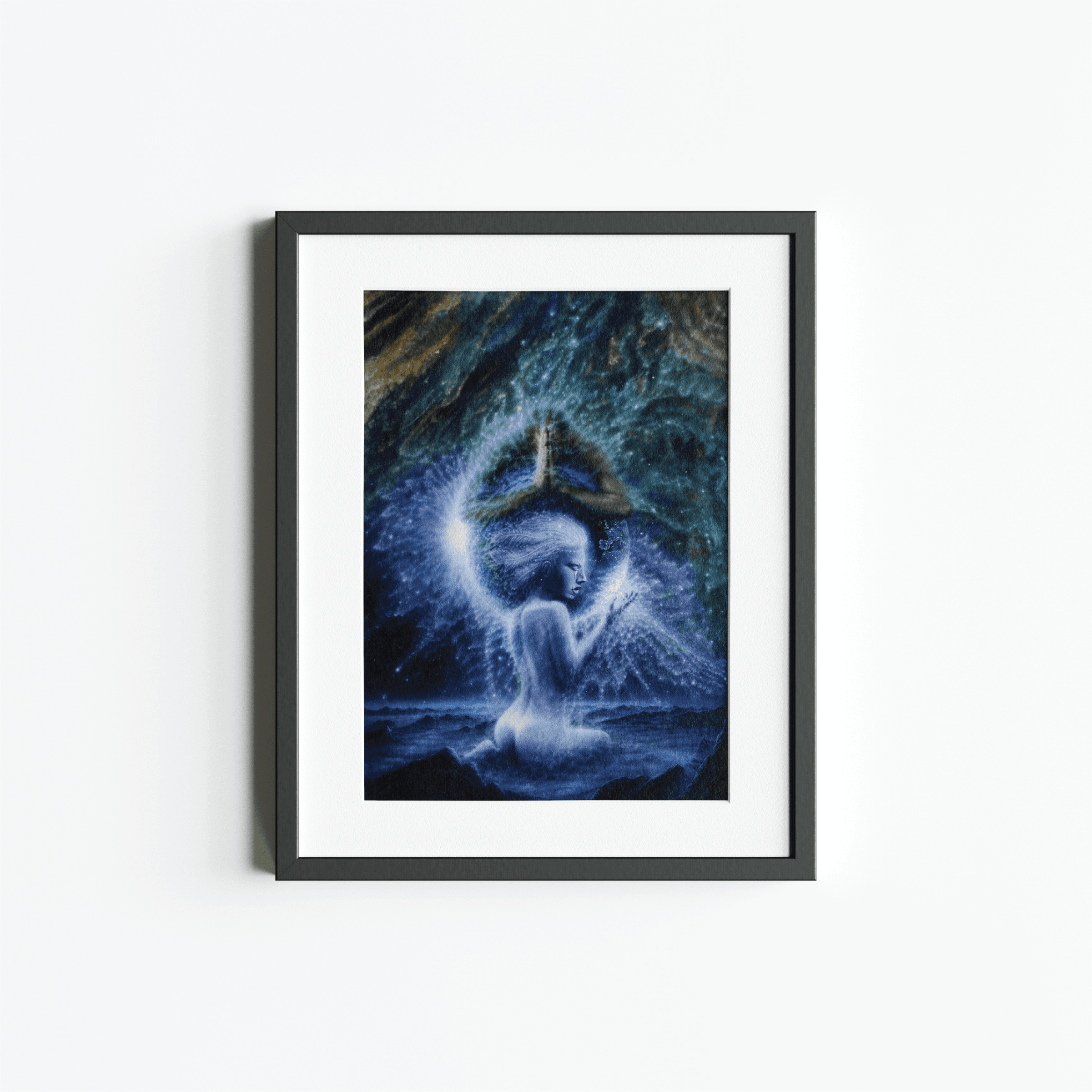 A luminous feminine figure emerges from dark desolate moon. Her body dissolving into soft currents of starlight as she gently cradles the Earth in her hands. Above her a mirrored celestial partner bows in quiet prayer hugging the earth. Their presence forming a radiant halo that encircles the planet in devotion. The surrounding cosmos swirls with color and movement suggesting a living universe responding to their shared intention. Together they embody a sacred union of empathy and reverence offering a vision of healing where love, presence and prayer restore balance to a fractured world.